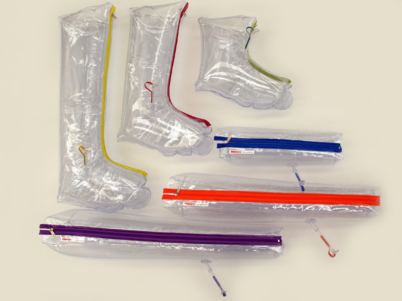CARACTERISTICAS:- Juego de férulas inflables por medio de un pivote con tapón de presión. Fabricadas con plástico cristal y cierre de nylon electro-selladas. Fáciles de limpiar y desinfectar.